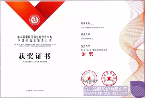 “中國建筑裝飾設計大獎”售樓處空間工程類金獎證書及獎杯